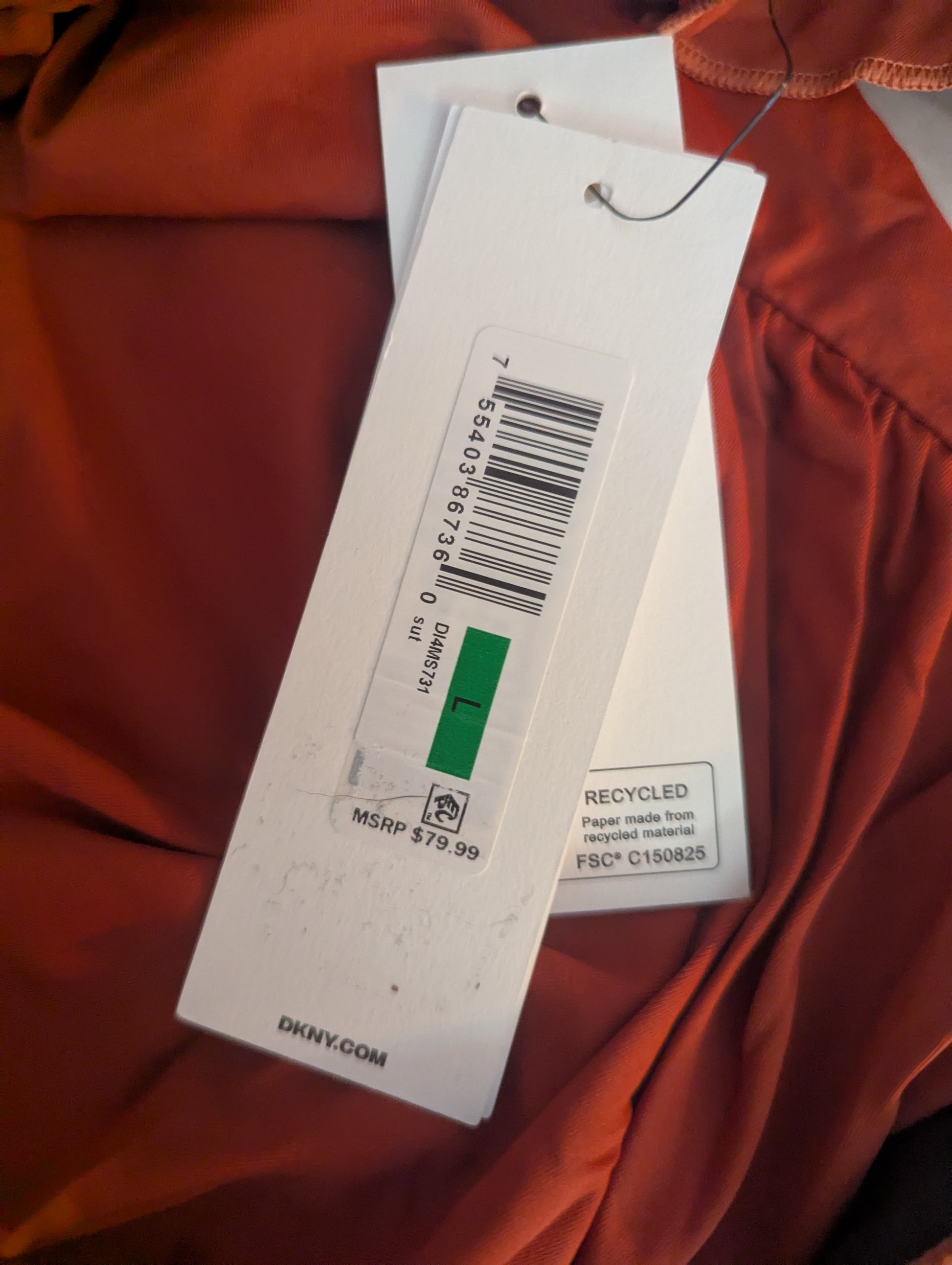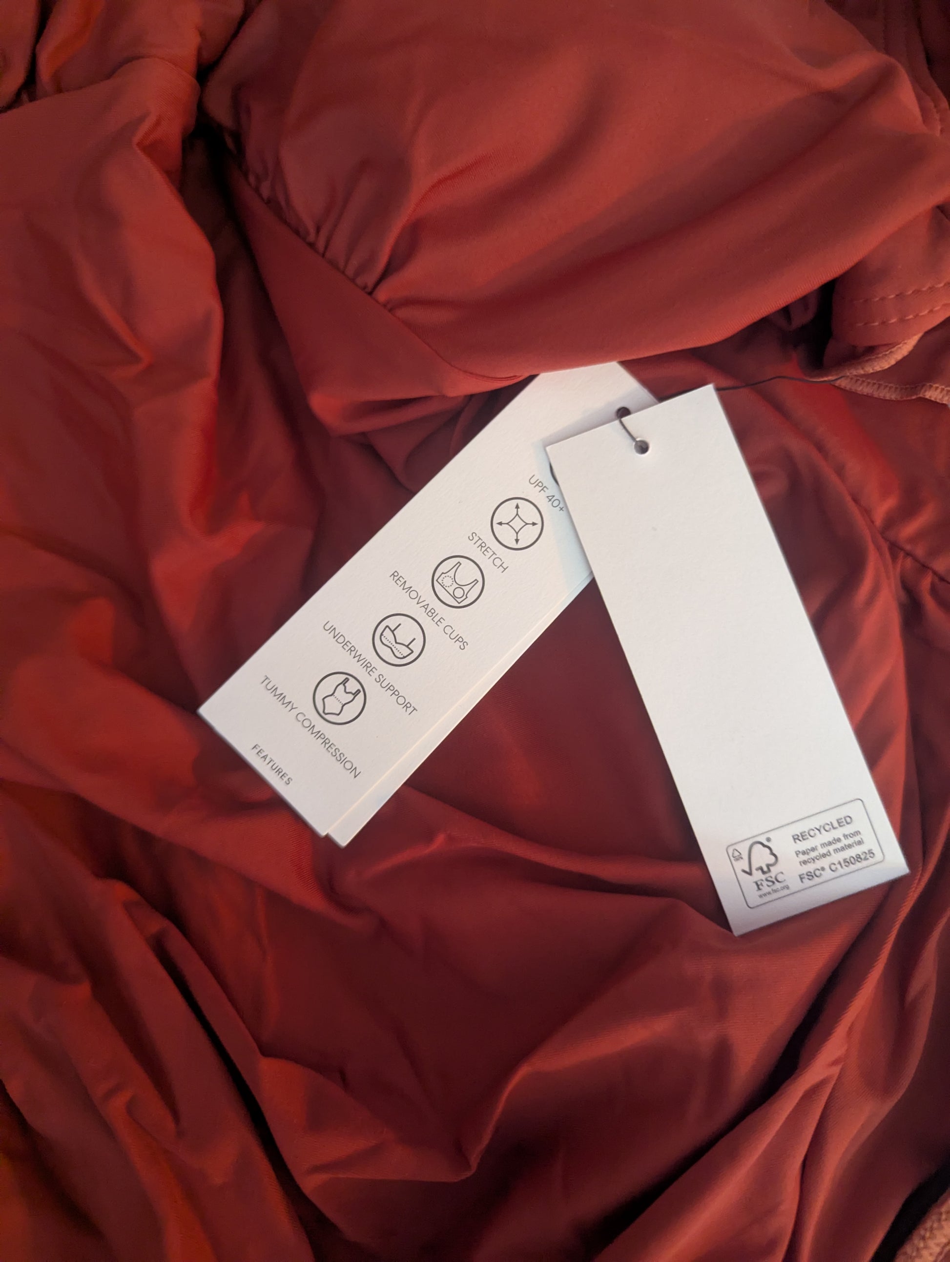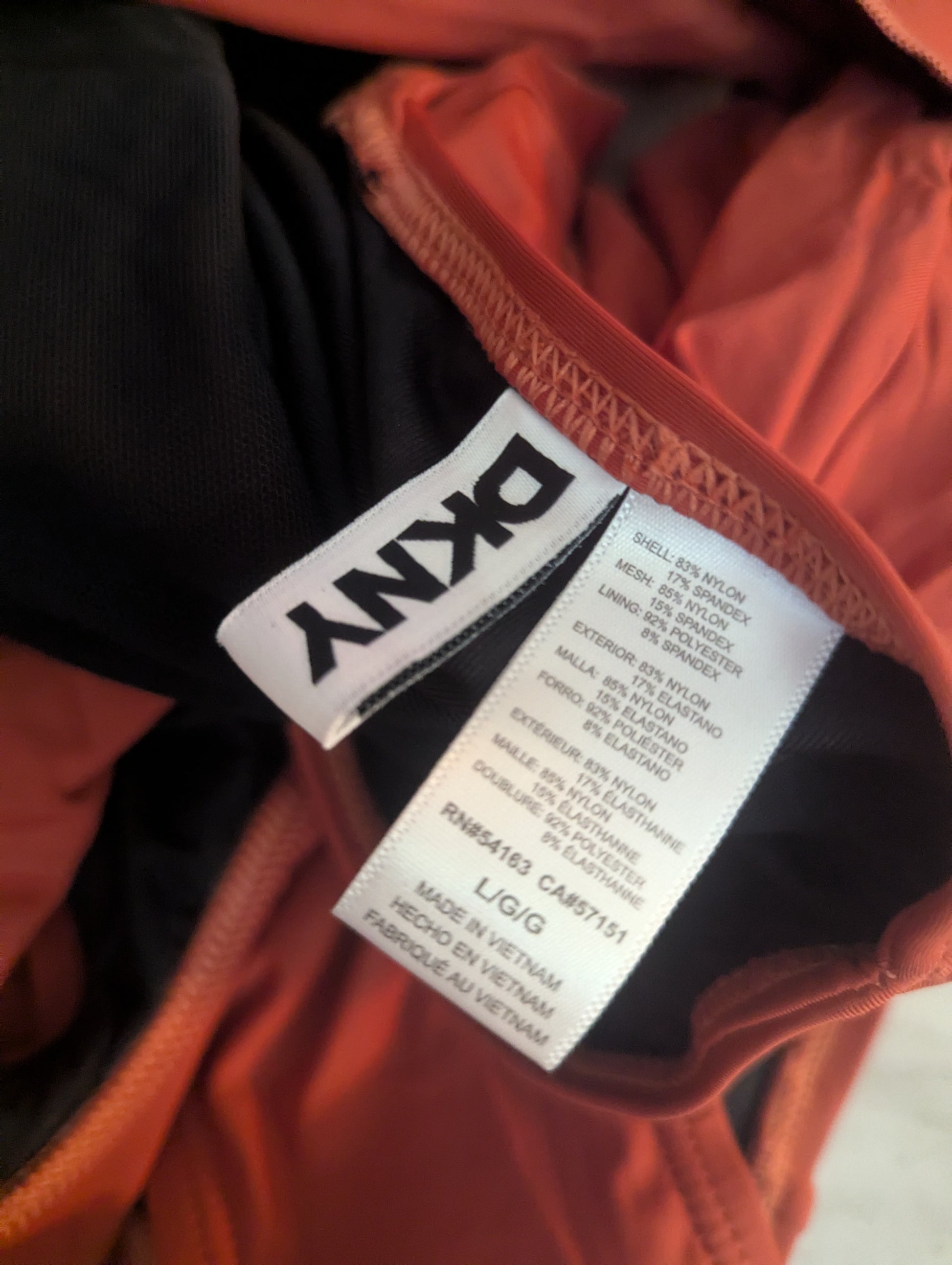 DKNY swimsuit size L, rust red one-piece swimsuit, DKNY ruffle swimsuit, slimming ruched swimwear, DKNY swimwear large, one-piece bathing suit DKNY, ruffle strap bathing suit, DKNY red swim suit new with tags